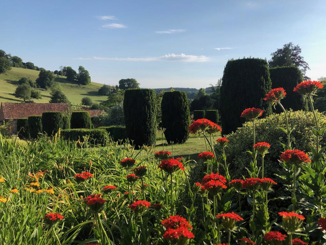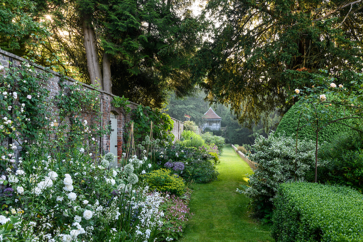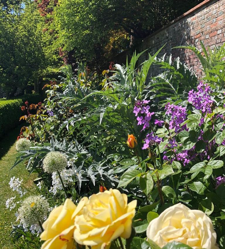 A 140m herbaceous border connects the Italianate Pleasure Garden to the Old Kitchen Garden Lined with apple and plum trees which blossom sensationally in the spring. The Old Kitchen Garden was replanted by Lady Camoys in 1980 and further developed more recently by Lady Ailsa Stonor. Dazzling displays of May-flowering irises, June-blooming peonies and heritage roses create a timeless beauty.