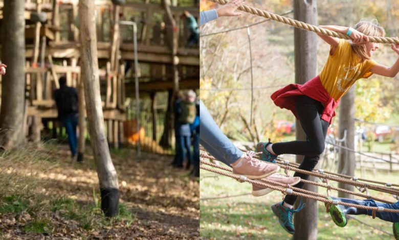 Climb tall wooden towers that twist among the trees, tiptoe across wobbly bridges, and slide down spiralling chutes that lead to secret hideaways. Explore hollow tunnels, balance on fallen logs, splash and giggle in the water play area, and discover carvings and clues left behind by the mysterious Tumblestone folk.